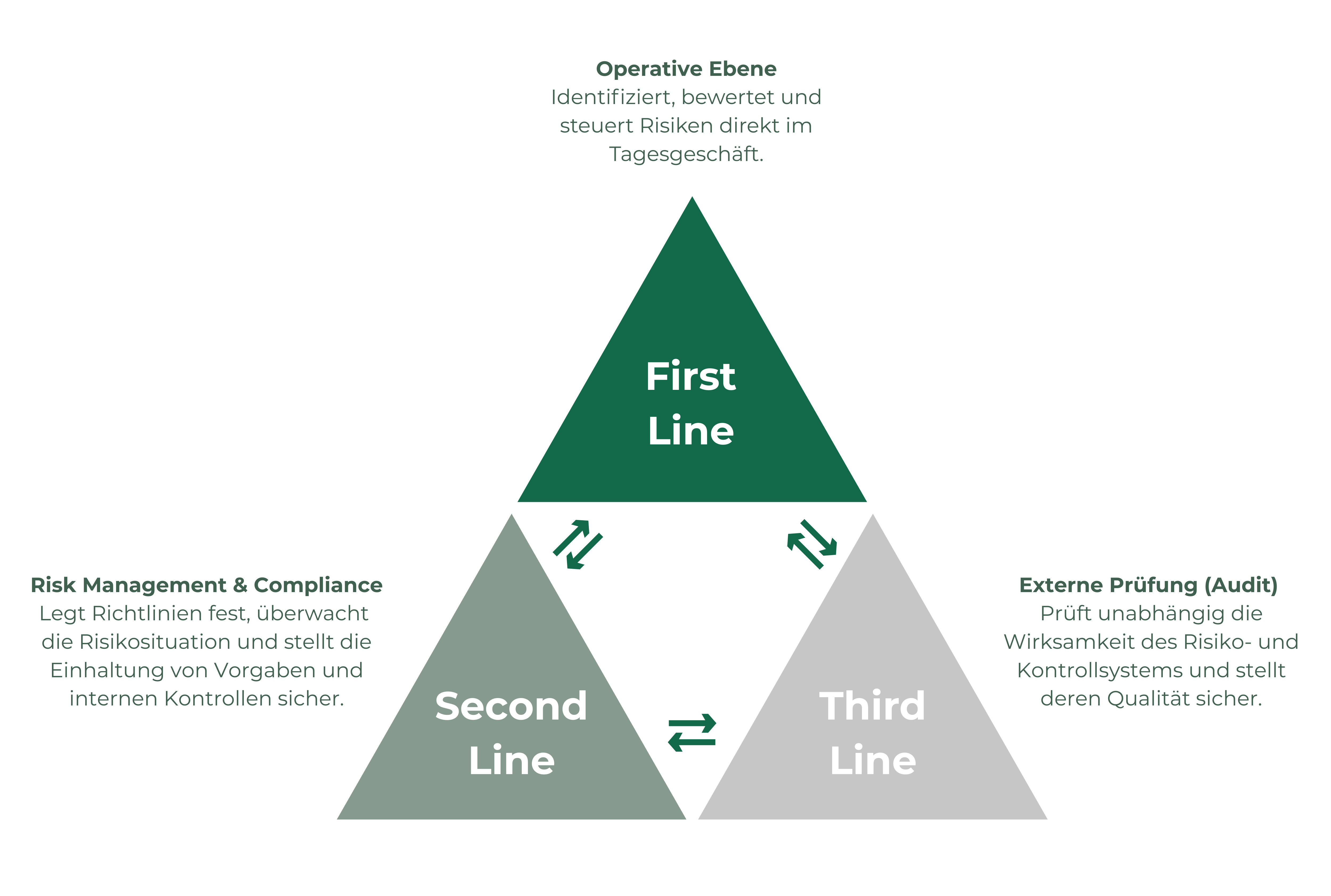 Die operative Ebene, bestehend aus Geschäftsleitung und Fachbereichen, trägt die primäre Verantwortung für das Tagesgeschäft sowie für die Identifikation, Bewertung und Steuerung von Risiken innerhalb ihrer Prozesse und Projekte. Risiken werden unmittelbar in den operativen Abläufen adressiert und durch geeignete Kontrollen und Massnahmen begrenzt.
