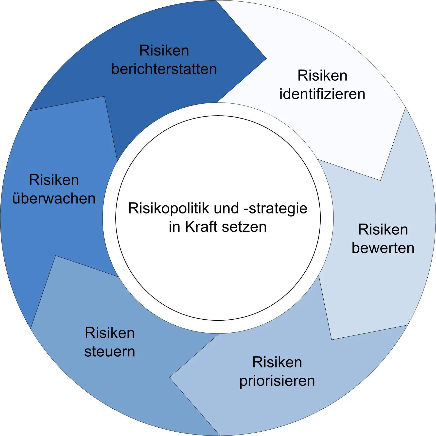 Das Risikomanagement folgt einem klar strukturierten und kontinuierlichen Steuerungskreislauf, der eine vorausschauende Planung und fundierte Entscheidungsfindung unterstützt. Risiken werden systematisch identifiziert, bewertet, priorisiert, gesteuert und laufend überwacht. Dieser Prozess stellt sicher, dass potenzielle Gefährdungen frühzeitig erkannt und geeignete Massnahmen zur Risikobegrenzung zeitnah umgesetzt werden.
