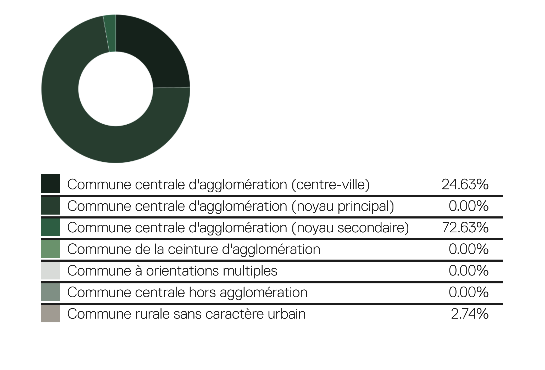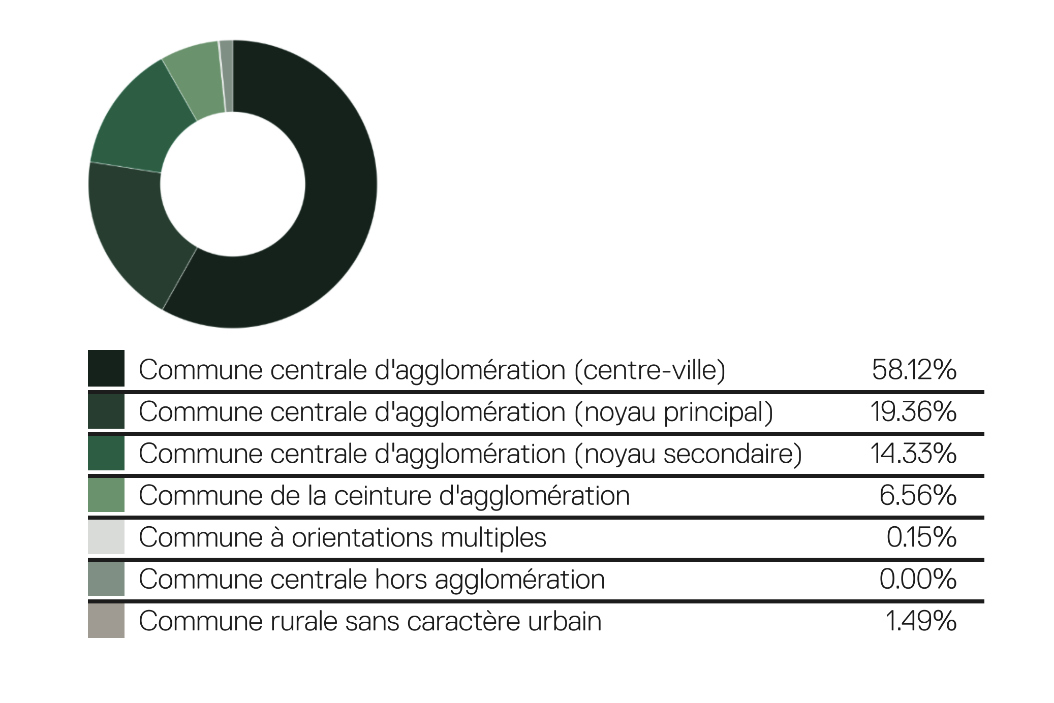 Le portefeuille de projets de la fondation de placement se concentre majoritairement sur des emplacements centraux au sein des centres d’agglomération en Suisse. Seule une faible part se situe dans les ceintures d’agglomération ou dans des communes rurales. Le caractère fortement urbain du portefeuille dépasse nettement la valeur de référence de l’indice KGAST et souligne la haute qualité des projets de Seraina Invest.